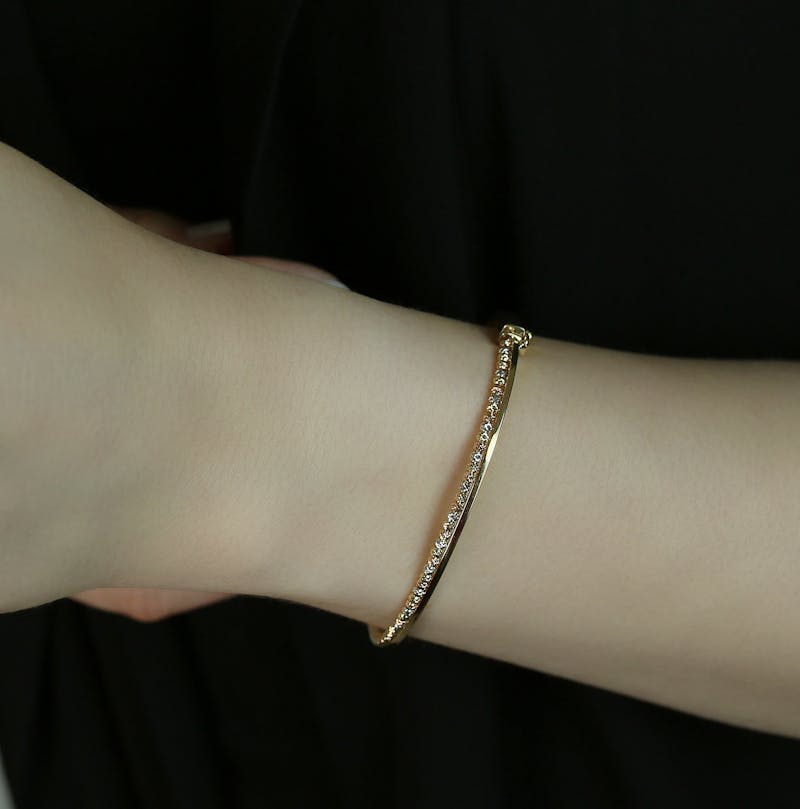 Un brazalete rígido que alterna zafiros azules naturales con diamantes en una línea central continua. Fabricado en oro blanco de 18k con abertura lateral para fácil colocación.